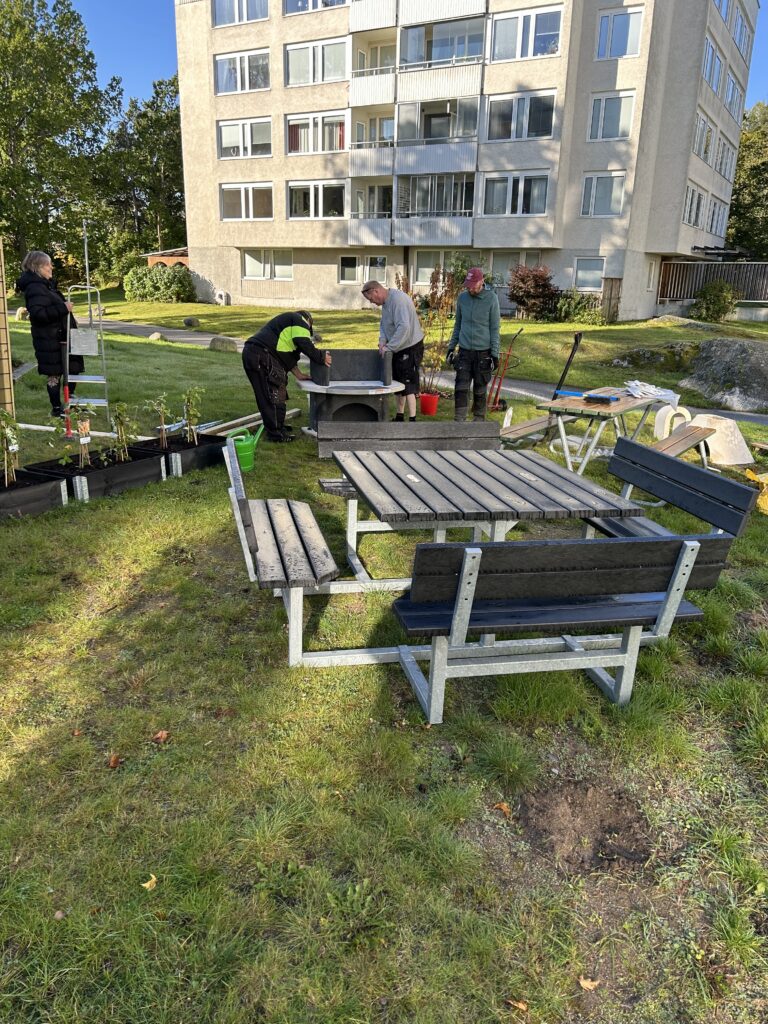 Trädgårdsgruppen visar – november 13, 2025 Trädgårdsgruppen av Styrelsen Under hösten har arbete genomförts för att rusta upp en ny grillplats i vårt område. Bilderna nedan visar arbetet och resultatet.